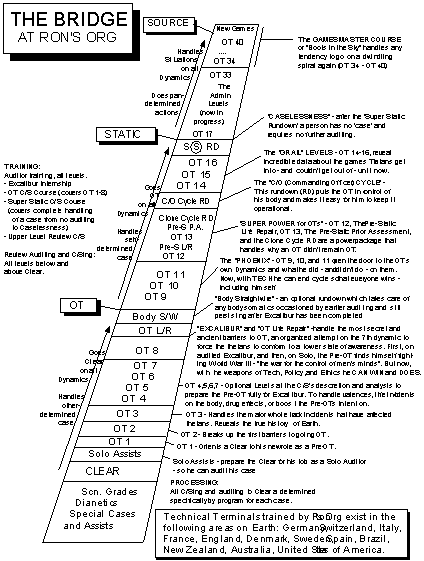 This is the possibility you get into. You find out on this Bridge - WHERE did LRH get the axioms from? They're not just HIS "idea", no way. YOU could sit down and write them, after you do the Bridge, you see? So we must thank him, because somehow he came into this game, into the area of this planet and he came in with the knowledge enough to be able to sit down and write those things, so you could start Scientology. And therefore he must have had a pretty caseless viewpoint about things. And I think you find that all through - he says: "An auditor should have no case. A staff member should have no case." And none of us should have any case, right? That's for sure . Because, when you really don't have a case and you've really handled all these things, YOU could sit down and write the Factors, YOU could sit down and write the Axioms. You can do it! Or you could write your own version of it, Because you would know exactly, how the guys got into this situation themselves, you know? You see? So you can - again, it says here on the side of the Bridge - there is a point of Clearness, OT-ness, Static Point and there's a Source Point up here. Well, that's what it means. After you become aware of all this and become aware of how to do the games, how to create games, how to make better ones and so on, then you can become a source of games, of new games and new ideas, right? That's all it is. OK. Any other questions?